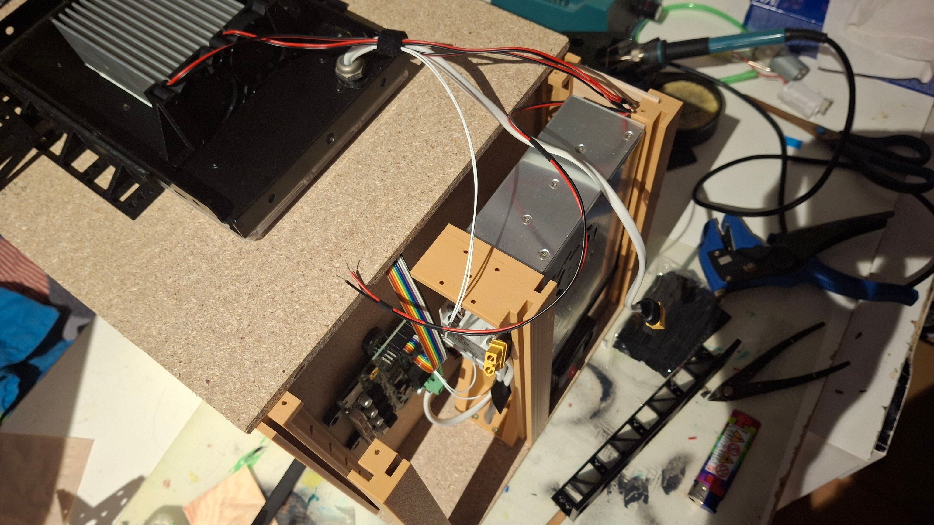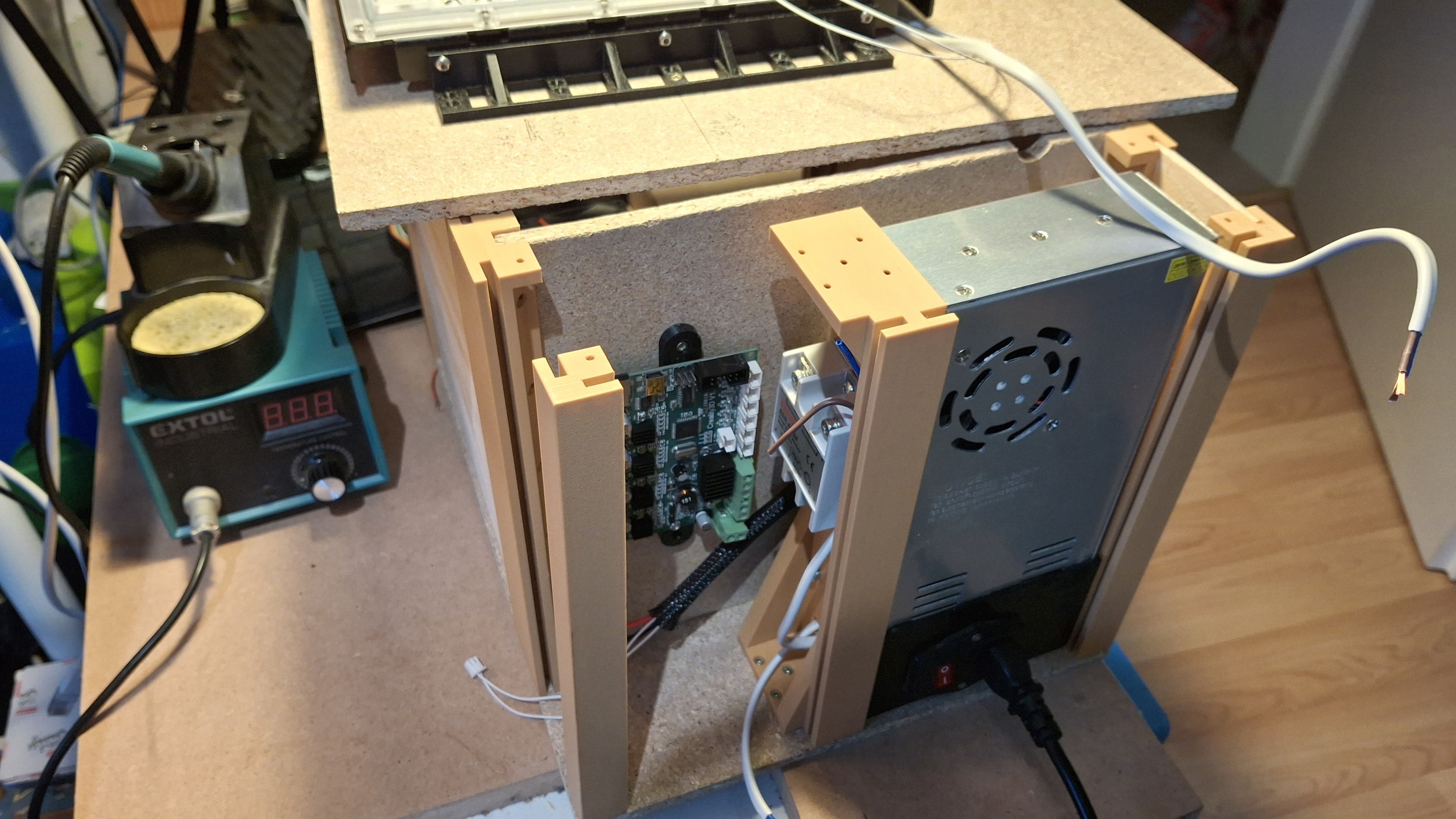 The design was fairly simple. I was mainly constrained by the (big) power supply and the bed. With the wooden board I had, this is the layout I liked the most: the bed is in front (how else…), the power supply is in the back standing vertically, and between them there’s a wall where the MCU and the solid-state relay are mounted.